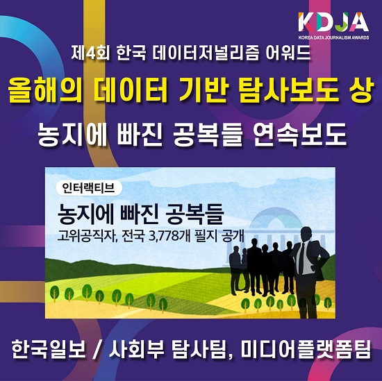 국내 데이터분석과 시각화 보도의 성취를 보여주는 ‘한국 데이터저널리즘 어워드’가 <한국일보> ‘농지에 빠진 공복들’ 등 7개 작품을 2021년 수상작으로 선정했다.
