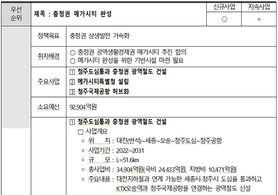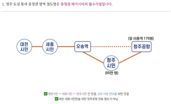 민주당과 국민의힘 양당 후보의 충북지역 주요 공약은 청주시 도심을 통과하는 충청권 광역철도 건설이다. 이재명 민주당 후보는 지난 12일 충북 청주시를 방문한 자리에서 충북지역 7대 공약을 발표하며 충청권 광역철도 건설을 1번 공약으로 제시했고, 윤석열 국민의힘 후보도 지난달 22일 청주를 방문해 충북 7대 공약 가운데 1번 공약으로 내세웠다. 충청북도와 남도 경계를 넘어 충청권 내부 주요 도시를 연결해 시민들이 일상적으로 오갈 수 있게 하는 대중교통 구축이 충청권 메가시티 구상의 핵심이라는 것이다.