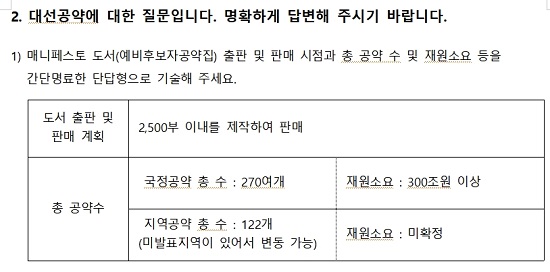 이재명 민주당 후보는 지난 16일 한국매니페스토실천본부에 제출한 답변서를 통해 270여 개 국정 공약 이행에는 5년 동안 300조 원이 필요하다고 밝히면서도, 후보를 배출한 경기도를 제외하고 전국 17개 지자체에서 수용한 122개 공약을 이행하는 데 필요한 예산은 명시하지 않았다. 윤석열 국민의힘 후보도 국정 공약 이행에는 266조 원이 필요하다고 했지만 119개 지역 공약 이행에 필요한 재원은 추계 중이라고만 답했다.