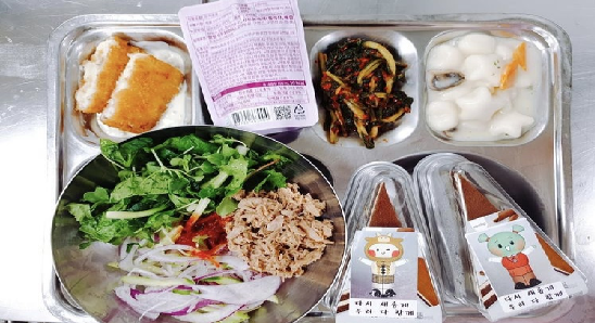 ▲ 충남 천안 복자여고의 채식 식판. 육류를 뺀 페스코 식단으로, 이날은 참치야채비빔밥, 치즈생선까스 등이 나왔다. ⓒ 복자여고 영양사 인스타그램