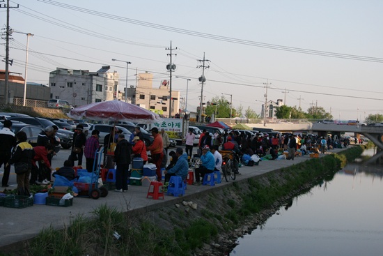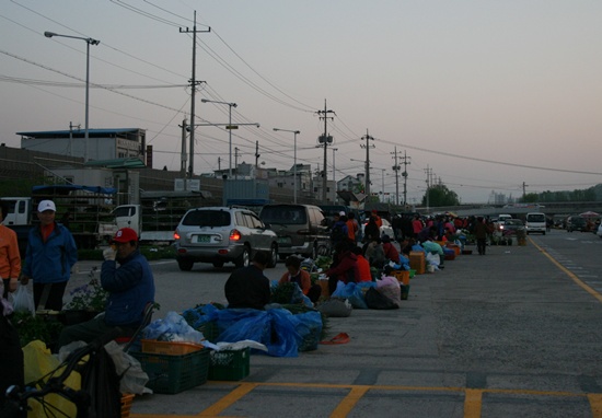 입하(立夏)가 하루 지난 6일 새벽 5시. 절기상 여름의 문턱을 넘었다고는 하지만 원주천 둔치는 쌀쌀한 기운이 감돌고, 사방은 여전히 푸르스름한 어둠에 싸여있다. 그러나 원주교와 봉평교 사이 6,250㎡ 가량의 길거리에 마련된 직거래장터에는 원주 각지에서 모인 칠팔십명 농민들이 자리를 잡고 손님맞이에 한창이다.