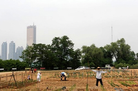연휴가 시작된 토요일인 26일 오후, 한강대교도 도심을 벗어나려는 차량 행렬로 꽉 막혀 있었다. 그러나 멀리 가지 않아도 좋다. 도심 속에도 흙 내음 풍기는 연둣빛 텃밭이 펼쳐진 곳이 있다. 이달 초 개장한 서울시 도시농업공원. 애초 한강 주변으로 계획되었다가 국토해양부가 개인의 하천부지 경작과 수질오염을 이유로 반대해 노들섬과 용산가족공원에 조성됐다.