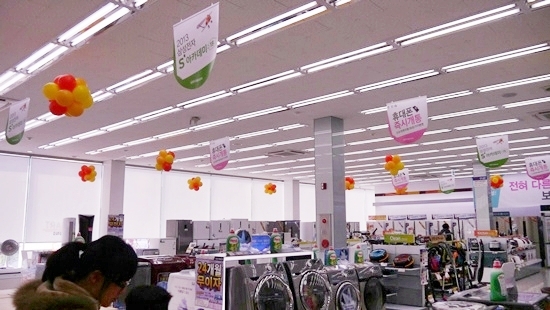 이곳 대형 매장들이 소비하는 전력은 얼마나 될까? 가전매장과 휴대폰 매장 각각 세 곳, 완구 매장 한 곳을 일일이 둘러보며 형광등과 전구 개수를 세어봤다. 형광등이 2500여개, 삼파장 전구가 1150개 정도. 사무실에서 주로 쓰는 형광등 32w와 삼파장 전구 20w로 소비전력을 계산해보면, 시간당 103kwh(103,000wh)가 이곳 7개 매장에서 빛으로 사라지고 있다. 400w짜리 전기 난로 250개를 밤낮으로 켜놓는 것과 같은 전력낭비를 하고 있는 셈이다.