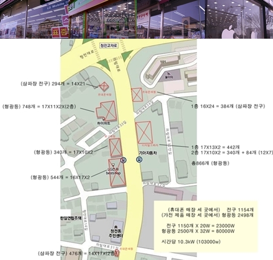 맞은 편 LG전자베스트샵이나 하이마트도 상황은 비슷하다. 베스트샵은 일정한 간격으로 박힌 삼파장 전구 말고도 형광등만 17줄에 32개씩 544개가 불을 밝히고 있다. 베스트샵 한 직원도 “많기는 많다”며 “반은 꺼도 문제가 없을 것 같다”고 말했다. 근처 휴대폰 전문 매장도 마찬가지다. 고작 휴대폰 몇 대 전시해놓고 매장 전체에 밤낮없이 전등을 켠다. 삼파장 전구가 가로 14개, 세로 17개씩 238개가 박혀있다.