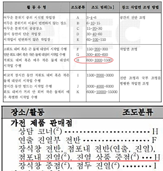 물론 시설이나 특정 활동에 따라 필요한 조도가 다르다. 정부에서는 한국산업규격 조도기준(KS A 3011)을 마련해 공공시설, 공장, 사무실, 병원, 상점 등 시설에 따라 적정 밝기를 정해놓았다. 사무실이나 도서열람실은 최소 150lx에서 최대 300lx사이를 유지하도록 했다. 상점의 경우 최소 600lx에서 최대 1500lx사이다. 규정 범위를 지켜야 장시간 활동을 하더라도 눈 건강을 유지할 수 있다.