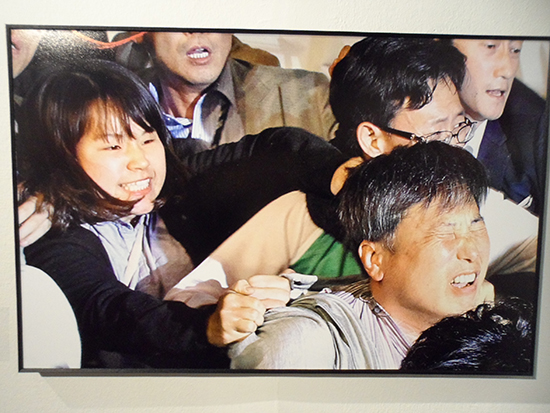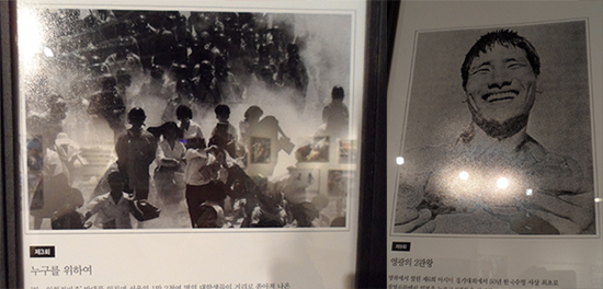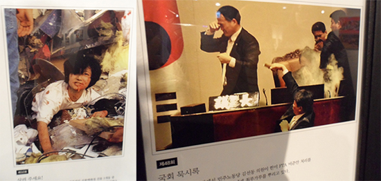 전시장 입구 쪽에는 1962년 보도사진전이 시작된 이후 대상을 수상한 역대 작품들이 전시됐다. 1964년 ‘한일협정반대’를 외치며 최루탄 속을 헤매는 하얀 한복 차림의 이화여대 학생들, 1970년 방콕 아시안게임에서 두 개의 금메달을 목에 걸고 활짝 웃는 수영선수 조오련의 모습이 눈에 확 들어왔다. 피투성이가 된 채 구조를 기다리는 1995년 삼풍백화점 붕괴사건 피해자, 2011년 국회에서 한미자유무역협정(FTA)동의안 날치기 처리에 항의하며 최루가루를 뿌리는 통합진보당 김선동 의원의 모습도 보는 이들을 역사의 순간으로 데려갔다.