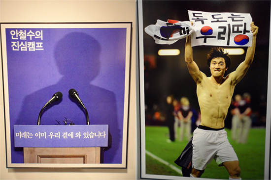 ‘사람을 읽다, 시대를 읽다’를 주제로 한 2012년 보도사진전에는 총선과 대선, 런던올림픽을 담은 사진들이 풍성했다. 대통령선거전을 담은 사진 중에는 안철수 전 후보의 기자회견 장면이 흥미롭다. 당시 안 전 후보는 문재인 후보와의 단일화 협의를 당분간 중단한다고 밝힌 뒤 회견장을 나갔는데, 그 모습이 연단에 비친 그림자로 사진에 담겼다. 평소 속내를 잘 드러내지 않는 안 전 후보의 그림자가 연단에 쓰인 ‘진심’이란 글자와 대비되면서 긴 여운을 남겼다. 또 폭우 속에서도 웃음을 잃지 않고 연설하는 박근혜 후보, 배춧잎을 머리에 덮은 익살스런 모습으로 배추상인과 대화하는 문재인 후보 등 대선 후보들의 인간적인 모습도 많았다. 대선 사진들을 지나면 ‘독도 세레모니’로 파문을 일으킨 축구대표 박종우 선수의 모습을 필두로 런던올림픽의 다채로운 장면들이 전시의 끝을 장식한다.