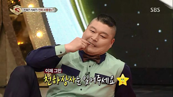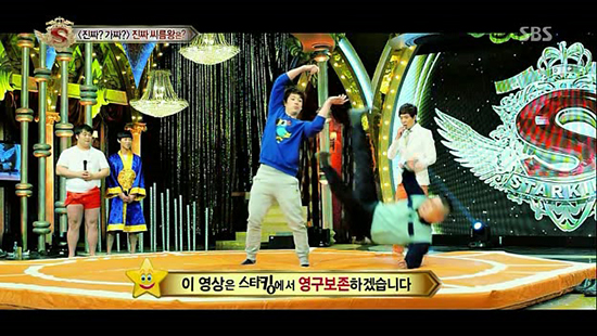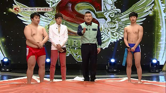 ‘진짜가짜를 찾아라’에서는 왕년의 천하장사 강호동이 120킬로그램(kg) 거구의 출연자는 물론 연예인 패널 중 하나인 가수 이창민(2AM)과의 허벅지 씨름에서도 패배해 대책 없는 ‘쩍벌남’이 됐다. 화면 자막은 ‘풀 뜯는 호랑이’라고 그를 놀렸다. 그런데 강호동을 제압한 거구의 출연자 김보성(23)씨를 61kg의 중학생 허석정(16)군이 쓰러뜨리면서 파란을 일으켰다. 2012년 대통령배 전국씨름왕대회 중학교부 씨름왕의 위용을 드러내는 반전이었다.