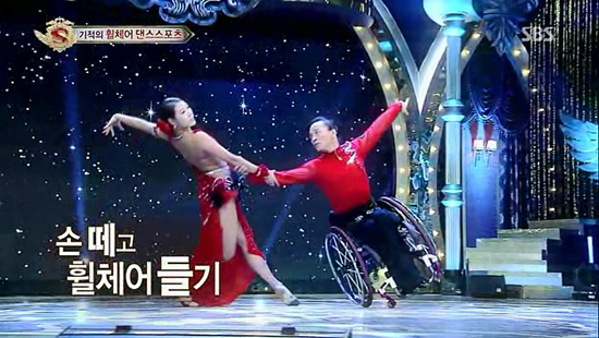 이날 <스타킹>은 재미와 놀라움에 이어 감동으로 마무리됐다. 스키 국가대표까지 지냈지만 1992년 패러글라이딩 추락사고로 하반신이 마비된 김남제(52)씨가 비장애인인 이노을(26·여)씨와 휠체어 댄스스포츠를 보여준 것이다. 2011년 일본컵 아시아대회 라틴3종목 1위 등 국제대회 수상경력을 자랑하는 김씨 커플의 멋진 모습은 ‘불굴의 의지’와 ‘열정’이 어떤 것인지를 뭉클하게 보여주었다.