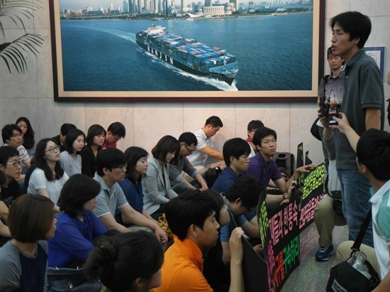 오전 11시, 130여 명으로 늘어난 <한국일보> 기자들은 거리로 나섰다. 먼저 한진빌딩 앞에서 10여 명의 언론노동조합 및 시민단체관계자들과 함께 한국일보 정상화를 위한 집회를 열었다. 전국언론노동조합 강성남 위원장은 “기자가 편집국에서 무력으로 쫓겨난 것은 1975년 동아자유언론수호투쟁위원회 민주언론실천선언 이후 처음 있는 일”이라며 “사주의 사익을 위해 언론사의 심장이라 할 수 있는 편집국에서 언론사의 피라고 할 수 있는 기자들을 내쫓았다”고 질타했다. 강 위원장은 “언론노동자의 자존심을 걸고 이번 일을 정의롭게 해결할 것”이라고 밝혔다.