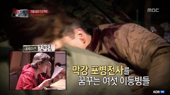 소녀시대와 카라, 씨스타, 시크릿 등 여자 아이돌스타들을 내레이터로 썼던 MBC의 예능프로그램 ‘진짜사나이’는 지난 2일과 9일 배우 김영옥씨를 기용해 호평 받았다. 화면 속 군인들의 상황에 몰입하게 만드는 편안한 목소리와 적절한 감정 표현이 좋다며 김씨를 고정 내레이터로 해 달라는 의견이 시청자 게시판에 잇달아 오르기도 했다. 시청자들이 배우로만 알고 있는 김씨는 사실 기독교방송(CBS)과 MBC의 성우 출신이다. 그녀의 내레이션이 영상과 잘 어울렸던 데는 이유가 있던 것이다.