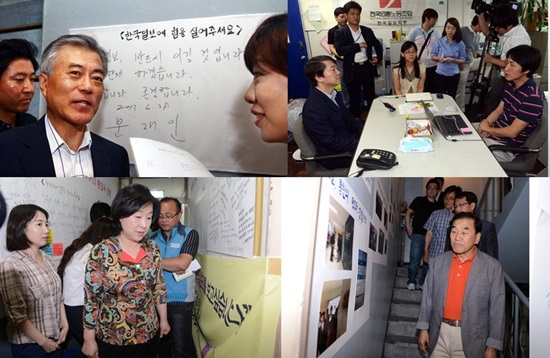 민주당 문재인 의원은 지난달 28일 한국일보가 입주한 서울 남대문로 2가 한진빌딩에서 농성중인 기자들을 방문, “언론의 자유, 편집권의 독립을 지켜내기 위한 투쟁에 지지와 존경을 보낸다”고 격려했다. 지난달 27일에는 안철수 무소속 의원과 노회찬 진보정의당 공동대표가 기자들을 찾았다. 안 의원은 “권력이나 자본에 의해서 편집권의 독립성이 흔들리고 훼손되는데 위기감을 갖고 있다”면서 “이 사태를 잘 극복해서 국민들의 사랑을 받는 정론지로서 설 수 있는 계기가 되길 바란다”고 말했다. 노 대표는 “국민의 힘으로 회복된 언론의 자유를 사주가 경영권을 쥐고 있다는 이유로 유린하고 있는 게 한국일보 사태의 본질”이라고 비판했다. 이외에도 민주당 배재정․이인영·홍종학 의원, 새누리당 이재오 의원, 심상정 진보정의당 원내대표 등이 한국일보 기자들을 격려 방문했다.