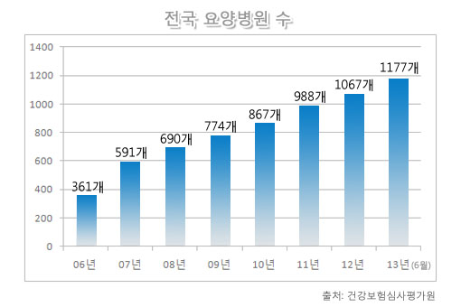 원인은 현행 장기요양보험법상의 노인의료복지시설이 신고만 하면 쉽게 설립할 수 있다는 데 있다. 요양시설의 환경이나 서비스, 접근성과 전문 인력 여부를 꼼꼼히 따지는 과정은 생략되기 일쑤다. 상가 건물을 개조해 운영하거나, ‘치료’가 아닌 ‘수발’을 목적으로 하는 요양원 수준의 서비스를 제공해도 아무런 제재를 하지 않는 것이다. 최근엔 경영난을 겪던 개인병원들이 우후죽순 치매요양병원으로 전환하기도 했다. 2006년 361개에 불과했던 요양병원이 제도가 제정된 2007년부터 빠르게 증가해 현재 약 4배가 된 데는 이런 배경이 있다.