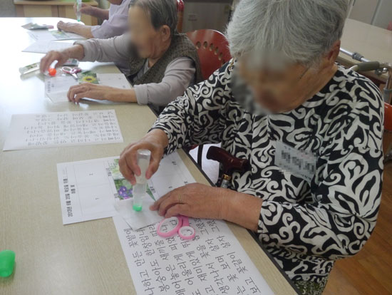예를 들어 장소와 사람, 사물 등을 기억하는 훈련에 집중하는 ‘청춘기억발전소’ 프로그램이 있다. 하루 2시간씩 주 3회로 운영되는 이 프로그램은 환자의 자존감을 저하시킬 위험이 있는 고강도의 교육 대신 익숙한 언어를 사용해 잔존기능을 최대한 유지하도록 하는 게 목표다. 이옥균(38·여)팀장은 “8주에서 12주 동안 교육을 받으면 그 효과는 6개월 정도 지속되는데, 병의 특성상 완치는 불가능하지만 증세가 더 악화되는 것을 막아주어 환자와 보호자의 만족도가 높다”고 설명했다. 이 병원은 정부에서 시설지원비를 받아 신축 중인 병동이 완공되면 환자들이 매일 방문해 치료받는 ‘데이케어’도 활성화할 계획이다. 이 프로그램은 60세 이상이면 누구나 무료로 참여할 수 있고, 보건소에서 치매 판정을 받은 환자는 우선적으로 혜택을 볼 수 있다.