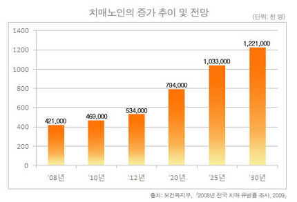 치매로 고통 받는 노인 인구는 빠르게 늘어나고 있다. 2012년 7월 보건복지부 발표에 따르면 65세 이상 노인인구는 2008년 501만6000명에서 2012년 589만명으로 4년간 17.4% 늘어난 반면, 치매로 진단된 노인은 같은 기간 42만1000명에서 53만4000명으로 26.9% 증가했다. 치매노인의 증가는 발병 자체가 늘어난 결과일 수도 있고, 공공검진제도의 도입으로 조기발견률이 높아져서일 수도 있을 것이다.