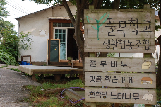 청명한 하늘을 떠받치고 있는 들판에는 벼와 채소, 이름 모를 풀들이, 도서관 앞마당에는 아이들이 건강하게 자라고 있었다. 좁은 언덕길로 들어서자 주민과 귀농자가 만든 협동조합들이 옹기종기 모여있다. 건물들은 대부분 낮고 작아서 자라나는 풀·꽃들과 더욱 잘 어울린다.