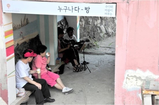 “원래 등산객들이 쉬던 곳이었는데, 방치된 탓에 활력이 없던 장소였어요. 조금만 바꾸면 커뮤니티가 가능하겠다 싶어 다방으로 개조를 했죠. 바다 벽화도 그리고 의자도 설치하고 소식통 역할을 하는 게시판도 달았어요. 기타 연주자를 초빙해 공연도 했고요.”
