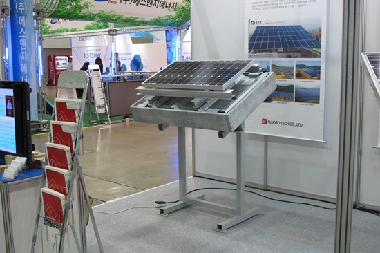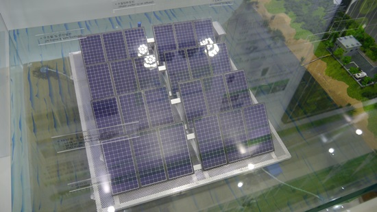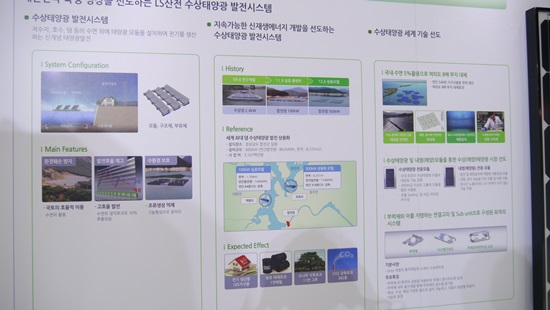 ▲ 수상태양광 발전시스템 모형이다. 태양광 발전에는 '반도체'가 이용되는데 섭씨 20도를 넘어서면 발전 효율이 떨어진다. 반도체 온도를 낮추기 쉬운 수상태양광 발전은 육상 설치에 비해 효율이 15~20%가량 높다. 경남 합천댐 근처에서 100kW급 발전기를 실증했고, 지난해 500kW급 상용 모델을 테스트했다. ⓒ 이성제