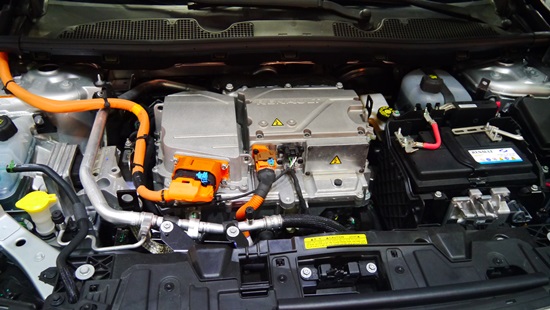 ▲ 르노삼성 SM3 전기자동차. '엔진'대신 '전기 모터'가 달려있다. 모터에 달린 주황색 전선은 뒷 좌석 근처의 배터리에 이어져있다. 모터 오른쪽 검은색 배터리는 운전석 속도계와 헤드램프 용으로 쓰인다. ⓒ 이성제