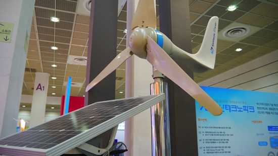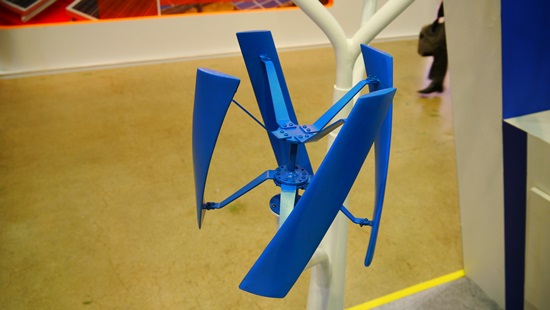 ▲ 새로운 형태의 소형 풍력발전기. 기존 '프로펠러 형' 발전기를 개량해 소음을 줄이고 디자인을 개선했다고 업체 측은 설명했다. 다만 프로펠러 형보다 발전 효율은 떨어진다. ⓒ 이성제