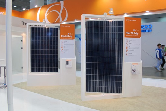 ▲ 관람객이 보기 쉽도록 세로로 전시한 태양광 패널. 업체 측은 기존 패널보다 무게는 1.5키로그램(kg), 크기는 2퍼센트(%) 감소한 제품이라며 앞으로는 소형화 ·경량화한 태양전지 모듈이 각광받을 것이라고 말했다. ⓒ 송두리