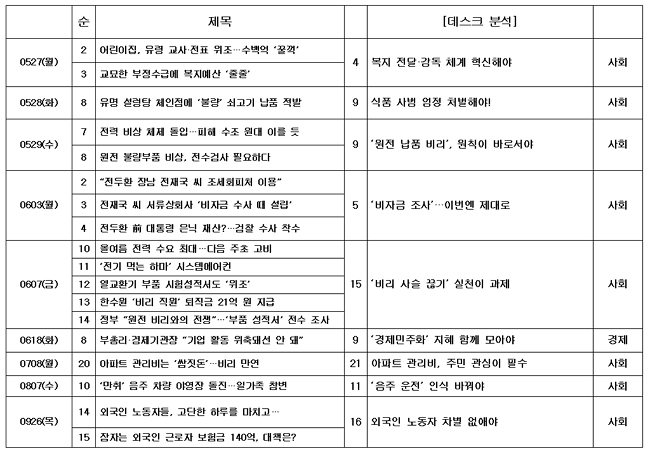 이 밖에 <교학사> 역사교과서의 사실관계 오류, 친일․독재 미화, 편향적 역사관 등이 논란이 된 시기에도 ‘역사교과서 왜곡’ 관련 데스크 분석은 한 건도 없었다. 최근 논란이 된 전교조 문제, 통합진보당 해산청구 문제 등과 관련해서도 마찬가지다. 정작 분석이 필요해 보이는 사안들은 비켜가고 있는 것이다.