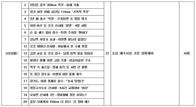 실제 1분 30초라는 짧은 분량을 감안하더라도 민망한 '분석'이 너무 많다. ‘데스크 분석’에 따르면, 납품비리나 공금횡령은 책임자를 '엄정 처벌'하고 '관리감독 체계를 혁신'하면 된다. 음주 운전은 '인식 전환'이 필요하고, 외국인 노동자들은 '차별하지 않아야' 한다. '비자금 조사는 제대로', 경제민주화는 '지혜를 함께 모아 해결할 수 있다.(표 참조) '데스크 분석'이 앞에 최소한 1꼭지 이상의 관련 이슈 리포트 다음에 나온다는 점을 고려하면 이런 내용이 왜 소중한 전파를 타야하는지 의문이 생길 수밖에 없다. 특히 지난 7월 22일자 '도심 배수시설 기준 강화해야'라는 데스크 분석은 앞서 '물난리' 관련 보도가 15꼭지나 나온 뒤다. (표 참조.)