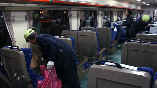 이들이 가장 먼저 한 일은 역방향 출발에 맞춰 의자를 돌려놓는 것. 6칸짜리 객차를 기준으로 210개쯤 되는 2인용 의자를 인부 2명이 맡아 신속하게 돌린다. 그 뒤를 따라 나머지 노동자들이 의자와 선반의 먼지를 털고, 커튼을 정리하고, 50리터(ℓ)짜리 비닐봉투에 쓰레기를 주워 담고, 대걸레로 바닥을 닦는 작업을 재빨리 진행한다. 마지막 순서는 내부 유리창 닦기. 노동자 한 명이 의자 사이를 몇 번이고 드나들면서 한 칸 당 18개의 큰 유리창을 물걸레로 박박 문질러 닦아냈다.
