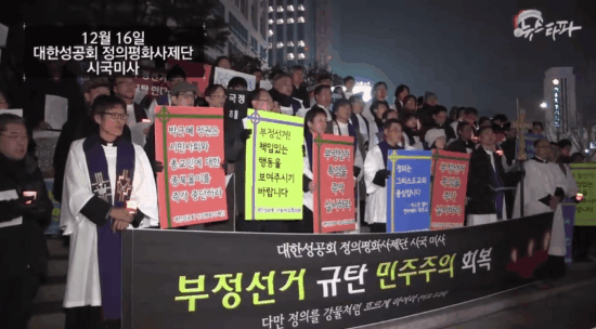‘신의 공의로움이 이 땅에서도 이루어지기를’ 간구하는 종교인의 입장에서 보면 눈앞의 불의를 외면하는 것은 소명을 저버리는 일이 될 수 있다. 프란치스코 교황이 불평등해소와 종교인의 사회참여 옹호 등 진보적 발언으로 높은 평가를 받으면서도 70~80년대 아르헨티나 군부의 ‘더러운 전쟁’에 침묵한 것 때문에 아직까지 비판받는 것을 주목할 필요가 있다. 우리가 진짜 문제 삼아야 할 ‘정치적 개입’은 재정 비리와 목회자세습 등으로 얼룩진 대형교회들이 막강한 영향력으로 ‘종교인 과세 반대’ 등 집단이기주의를 관철하는 게 아닐까? 2천년전 예수 그리스도의 모습을 정말로 닮은 이들은 으리으리한 건물 속의 그들이 아니라 민주주의와 정의, 양심을 위해 차가운 거리로 나선 사제, 수녀, 목사와 신도들이다.