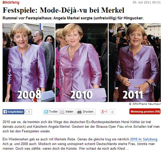 그녀는 같은 디자인의 옷을 색상만 다르게 해서 계속 입는 걸로 유명한데, 가디언은 메르켈의 의상을 채도별로 나열하며 ‘비극의 광경(The Spectacle of Tragedy)’이라 표현하기도 했다. 자기 체형과 외모에 적합한 몇 개 디자인을 고수하며 색상에만 변화를 주는 메르켈의 무신경함은 단골 디자이너의 맞춤복만 착용하는 박대통령과 비교된다. 유럽 최고 음악제로 알려진 ‘잘츠부르크 페스티벌’을 방문하면서 2008년, 2010년, 2011년 세 번 모두 똑같은 옷을 입었던 메르켈의 패션을 과연 ‘비극’이라 할 수 있을까?