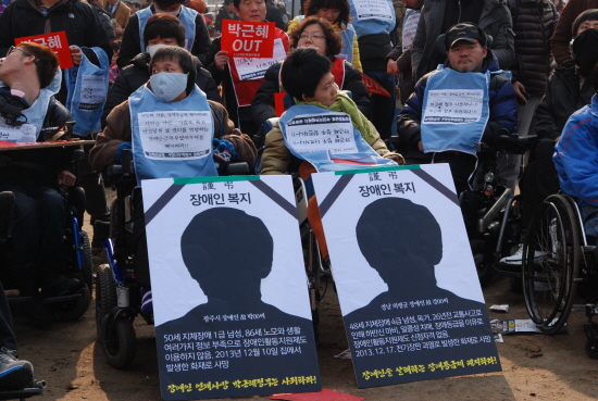 휠체어에 앉아 ‘공약 이행’을 외치던 권기대(35·서울 광진구)씨는 “광화문 광장에서 장애인특별법 폐지 등을 위해 526일 째 무기한 농성 중”이라며 “우리 같은 장애인들도 인간다운 삶을 살게 해 달라”고 힘겹게 말을 이어갔다. 장애인등급제란 행정편의를 위해 장애인을 1~6등급으로 나눠 의료지원을 차등적으로 하는 제도다. 장애인단체에서는 ‘사람을 등급으로 매겨 관리한다는 점 자체가 반인권적’이라며 폐지를 주장하고 있다. 박근혜 대통령도 대선 후보 시절 장애인등급제 폐지를 공약했다.