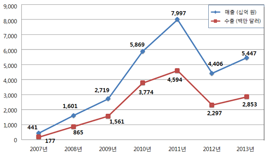 국내 태양광산업은 80년대 삼성, LG 등 대기업 위주로 시작됐으나 본격화한 것은 2007년 무렵이다. 신재생에너지원으로 만든 전기에 대해 일정한 수익을 보장해 주는 발전차액지원제(FIT)가 탄력을 받기 시작한 게 이 때다. 그해 태양광 설비 신규설치 용량이 45MW였고 다음해 275MW가 새로 설치됐다. 우리나라는 태양광 모듈(태양전지결합체)과 인버터(전기전환장치)를 만드는 데 사용되는 반도체 기술과 액정표시장치(LCD) 기술이 뛰어나기 때문에 태양광발전에 경쟁력이 있는 편이다. SNE리서치에 따르면 2013년 우리나라 태양광산업의 매출은 5조4000억원으로 2007년 4410억원 대비 10배 이상 증가했다. 같은 기간 수출은 약 16배, 고용도 약 6배로 늘었다.