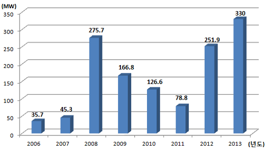 태양광산업협회에 따르면 2012년까지 국내에 설치된 태양광발전의 누적용량은 약 980MW다. 지난해 신규 설치용량 330MW을 합하면 지난해까지 누적 규모는 대략 1310MW로 고리원전 1호기(580MW)의 2배에 해당한다. 하지만 일본 태양광 규모에 비하면 10분의 1 수준에 불과하다.