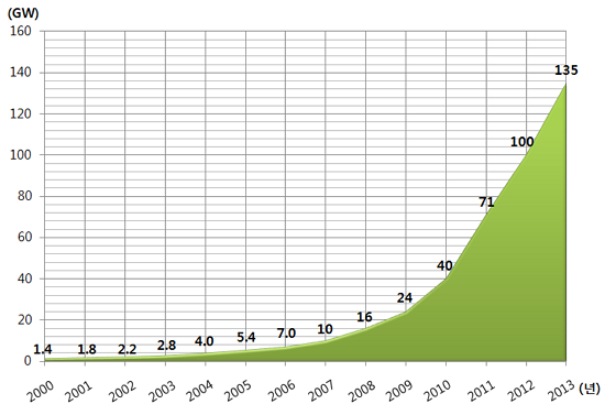 환경운동가로 활약하고 있는 앨 고어 전 미국 부통령은 저서 <우리의 선택>에서 햇빛에너지의 잠재력을 이렇게 강조했다. 세계 각국도 이런 햇빛에너지에 점점 뜨거운 관심을 쏟고 있다. 1970년대 2차례 석유위기를 겪으면서 반짝 일어났던 태양광·태양열 투자 열기는 이후 석유가격 하락과 상승에 따라 많은 기복을 겪었다. 그러나 2000년 이후 기후변화의 심각성과 유가폭등에 대한 위기감 등이 맞물리면서 많은 나라들이 햇빛에너지 투자에 박차를 가하고 있다. 지난 2007년 2.7기가와트(GW:MW의 1000배)에 불과했던 태양광 신규설비용량은 2008년 6.6GW, 2009년 7.7GW로 증가한 데 이어 지난해에는 35.7GW나 됐다. 2012년 말까지 전 세계 태양광시장 규모가 약 100GW였는데 2013년에 약 35%의 성장률을 기록한 것이다. 국제에너지기구(IEA)는 태양광 발전이 2030년까지 세계 에너지 발전량의 5%, 2050년에는 11%를 차지할 것으로 전망하고 있다.