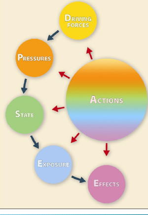 권 교수는 서울시를 예로 들어 설명했다. 서울시 대기오염의 가장 근본적인 원인은 서울시에 너무 많은 사람이 산다는 것이다. 이것이 ‘반응을 유발하는 힘’(Driving forces)이다. 사람이 많이 살면 출퇴근 수요가 많고 교통량이 많을 수밖에 없는데, 이것이 ‘압력’(Pressures)이다. 대기오염이 심한 ‘상태’(State)는 사람을 대기오염에 ‘노출’(Exposure)시키고, 결과적으로 건강에 안 좋은 ‘영향’(Effects)을 끼치게 된다.