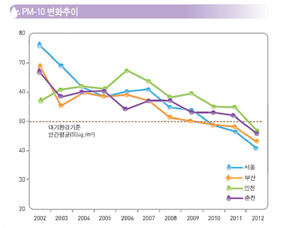 ‘중국발 미세먼지’가 왜곡된 용어라는 것은 두 나라의 미세먼지 오염도를 비교해보면 알 수 있다. 최근 통계를 보면 중국 미세먼지 오염도는 여전히 심각한 데 견주어 우리나라 오염도는 감소하고 있다. 2002년 80μg/㎥이었던 서울시 미세먼지 오염도는 2010년 대기환경기준 연간평균인 50μg/㎥ 아래로 떨어져 2012년에는 40μg/㎥ 선까지 내려왔다. 반면 2013년 1월 중국 베이징의 초미세먼지 농도는 993㎍/㎥로 최고점을 찍었다.