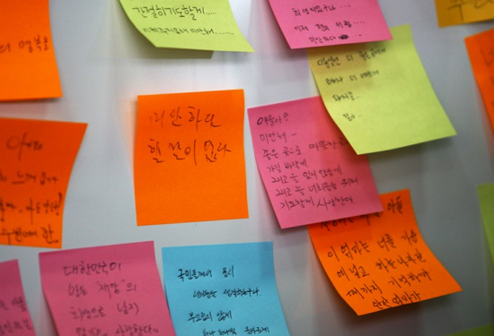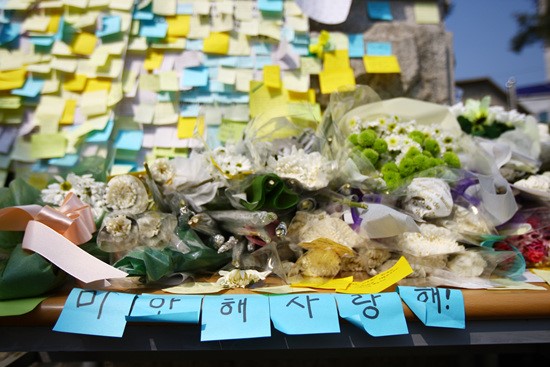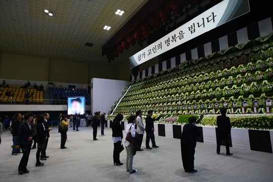 세월호 침몰사고로 숨진 단원고 학생과 교사들을 기리기 위한 임시합동분향소가 23일 경기도 안산시 올림픽기념관 실내체육관에 마련됐다. 분향소에는 희생된 단원고 학생 44명과 교사 3명 총 47명의 영정사진과 위패가 국화꽃 등으로 장식된 제단에 안치됐다. 이날 오전 9시부터 단원고 동료교사와 학생, 안산시민, 정치인과 연예인 등 각계 인사들의 조문이 이어졌다. 오후 2시쯤 통합진보당 이정희 대표가 방명록을 작성할 때 카메라가 몰렸다. 이정희 대표가 떠난 후 단원고 총학부모회 관계자는 “행사치레 할거면 관둬라”며 방명록과 집기를 던지는 일도 있었다.