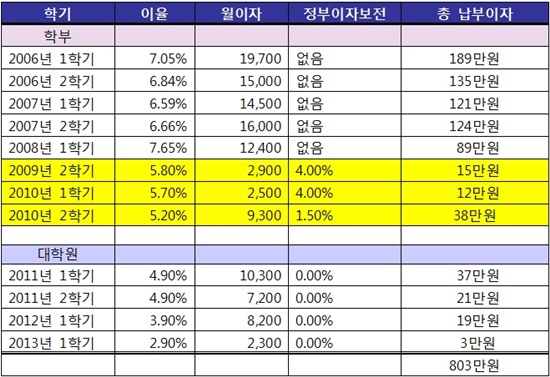 정씨는 2006년 1학기에 빌린 대출 한 건에 대해 지난 8년 동안 이자만 189만원을 갚았다. 그는 학부에서 8건, 대학원에서 4건 등 총 12건의 학자금 빚을 졌다. 지금까지 내온 이자만 거의 800만원에 이른다. 이 중 80%를 차지하는 650만원이 2005년 2학기부터 2009년 1학기까지 실시됐던 정부보증학자금 대출의 이자로, 연 6.66~7.8%가 적용됐다. 2009년 2학기부터는 학자금대출의 이자율이 낮아지고(현재 연 2.9%) 정부이자지원도 이뤄지면서 부담이 많이 줄어든 편이다.