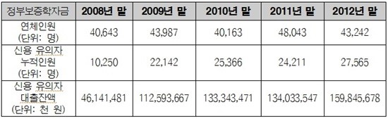 2012년 12월 기준으로 학자금대출이 6개월 이상 연체된 ‘신용유의자’ 4만3000여 명 중 절반을 넘는 2만7000여명이 정부보증학자금 대출을 연체한 사람들이다. 2009년 2학기부터 한국장학재단이 설립돼 직접 대출을 하게 되면서 정부보증학자금제도는 사라졌지만 당시 받은 대출금을 계속 갚아야 하는 청년들은 취업난 속에서 이중고를 겪고 있다. 현재 한국장학재단은 각각 2009년과 2010년부터 시행된 일반상환학자금과 든든학자금 생활비 대출자에 대해 저금리의 전환대출과 유예대출 등으로 부담을 줄여주고 있다. 그러나 2005년 2학기에서 2009년 1학기에 학자금대출을 받은 사람들은 이런 혜택을 받지 못한다.