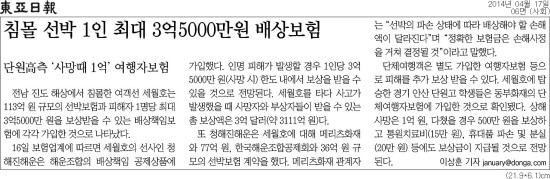 (동아일보 4/17 침몰 선박 1인 최대 3억5000만원 배상보험