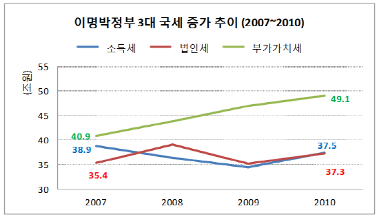 선대인경제연구소 선대인 소장은 이명박정부 동안 3대 국세(소득세, 법인세, 부가가치세) 증가추이 그래프를 보여주며 감세정책의 폐해를 지적했다. 직접세인 소득세와 법인세 비중은 줄어든 반면 간접세인 부가가치세 비중은 늘어났다. 같은 기간, 4대 국세 증가율 역시 소득세는 -3.6%, 법인세는 5.2% 증가에 그친 것과 달리 부가가치세와 유류세는 20%를 웃돌았다. 간접세가 늘어나면 소득의 역진성이 높아진다. 소득이 낮은 사람이 더 높은 세부담을 지게 되는 것이다.