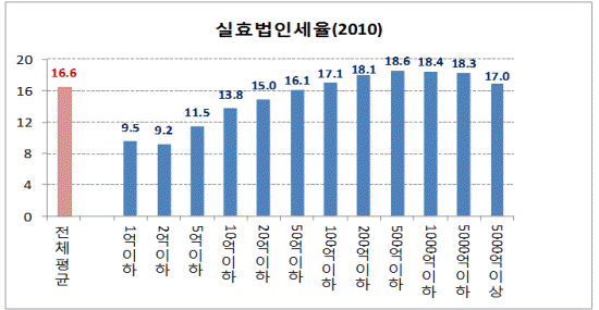 비과세 감면 혜택이 재벌기업들에 집중되다 보니 2010년 삼성전자와 현대자동차의 법인세 실효세율은 각각 11.9%와 16.5%였다. 실제로 2007~2010년 사이 5000억원 이상 대기업의 법인세 부담은 줄어 들었다.
