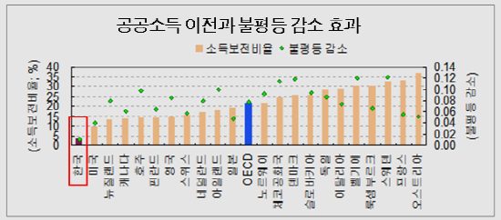 그는 ‘세금을 제대로 걷는 것만큼 세금을 제대로 쓰는 것도 중요하다’고 강조했다. 세금을 제대로 걷지도 않고 엉뚱한 곳에 쓰니 우리나라에는 ‘공공소득 이전을 통한 불평등 감소효과’가 거의 쥐꼬리 수준이다. 아래 표를 보면 OECD 평균에 한참 못 미친다.