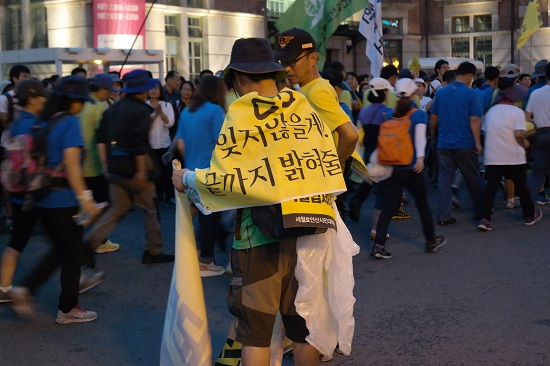▲ “잊지 않을게. 끝까지 밝혀줄게” 라고 쓰인 현수막을 두르고 행진하는 한 시민의 모습. ⓒ최선우