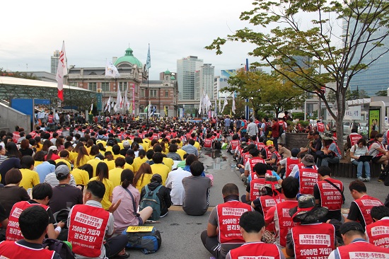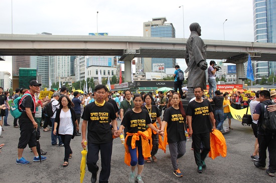 ▲ 유가족과 시민 등 1000여명이 손을 맞잡고 서울역광장으로 들어서고 있다. 이들을 기다리던 시민들은 박수로 환영했다. ⓒ배상철