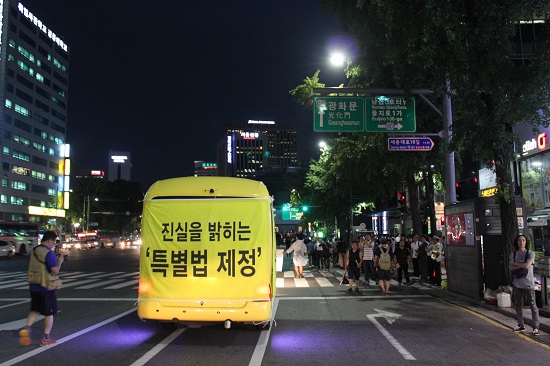 ▲ '진실을 밝히는 특별법 제정'이라는 현수막을 단 버스가 선두에서 행진을 이끌었다. ⓒ배상철