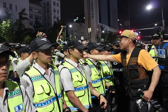 ▲ 광화문광장으로 향하는 길목을 경찰이 막아서자 한 시민이 항의하고 있다. ⓒ배상철
