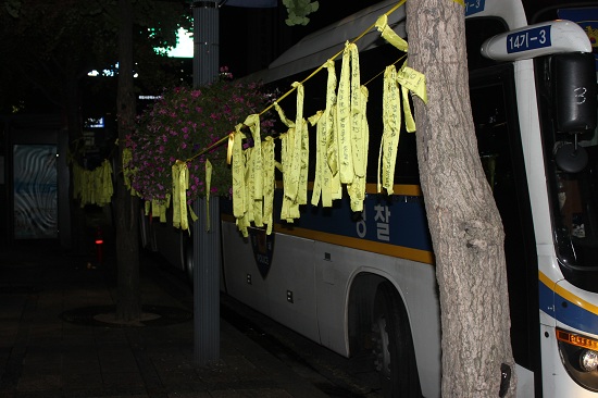 ▲ 유가족과 시민들이 광화문으로 진입하지 못하도록 막아놓은 경찰버스 앞에도 노란리본이 걸려있다. ⓒ배상철