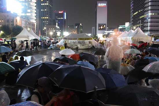 ▲ 경찰의 통제로 광화문광장에서 예정된 집회가 지연되는 동안 비가 억수같이 쏟아지고 있다. ⓒ배상철
