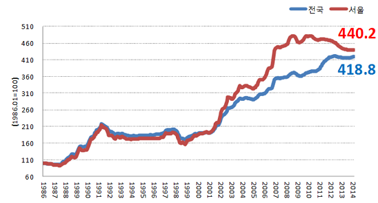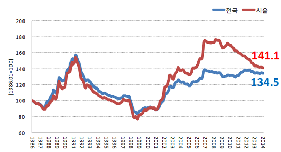 지난해 노벨경제학상을 수상한 로버트 실러 교수는 미국의 대표적인 주택가격지수인 케이스 실러 지수를 창안한 사람 중 한 명이다. 1980년대부터 실질가격에 바탕을 두고 미국 주택가격 주기(cycle)를 설명하는데 10년에서 20년 주기마다 늘 오르락내리락하는 모습을 띄고 있음을 발견했다. 알려진 것과 달리 주택가격이 계속 올랐던 적은 없었다. 선 소장은 우리 주택시장도 마찬가지라며 “실질가격으로 부동산시장을 바라봐야 하지만 부동산 업계에서는 늘 오름세를 보이고 있는 명목가격 그래프를 보여준다”고 지적했다.